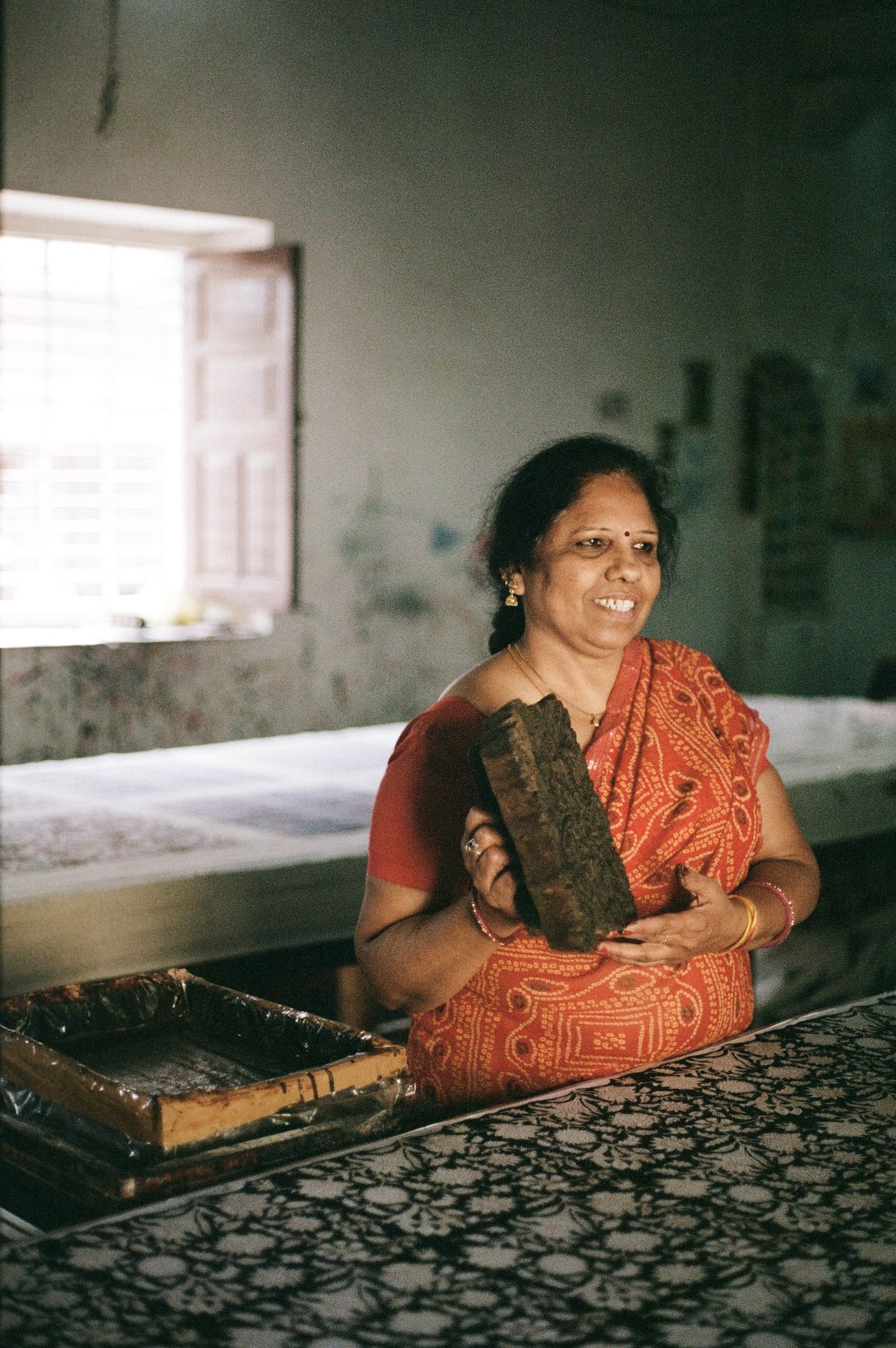 Our signature hand block printed Kyra design in Pepper ~ a traditional Jaal block print featuring a network of white flowers bordered with light brown detailing on a soft black base.
