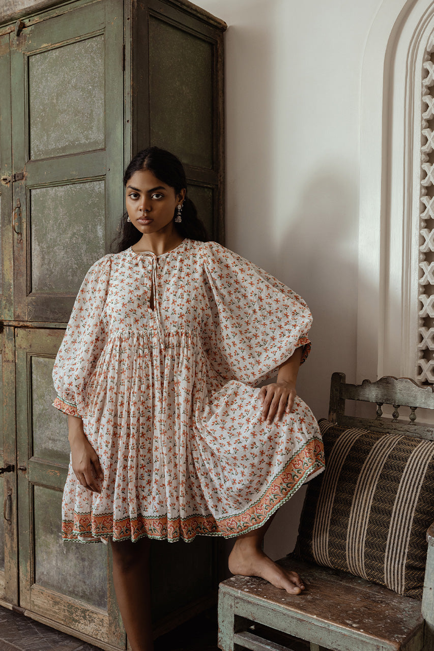 Our signature Kyra Dress in a mini length and beautiful coral hue, delicately adorned with traditional hand-block printed blooms in peach hues, each petal and pattern tell a story of elegance.