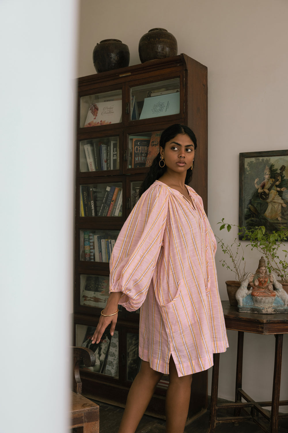 Inspired by a vintage silhouette and crafted with handloom fabric ~ a rare and exclusive sustainably handmade textile in modern times. This intentionally oversized mini dress features a soft pink colour-way contrasted with pinstripe detailing in white, brown & yellow tones, while the shape offers a poet-style collar with optional tie, and romantic billowy sleeves finished with soft elasticated cuffs and pockets at the hip.